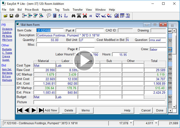 - Cost types – Material, Labor, Equipment, Subcontractor…